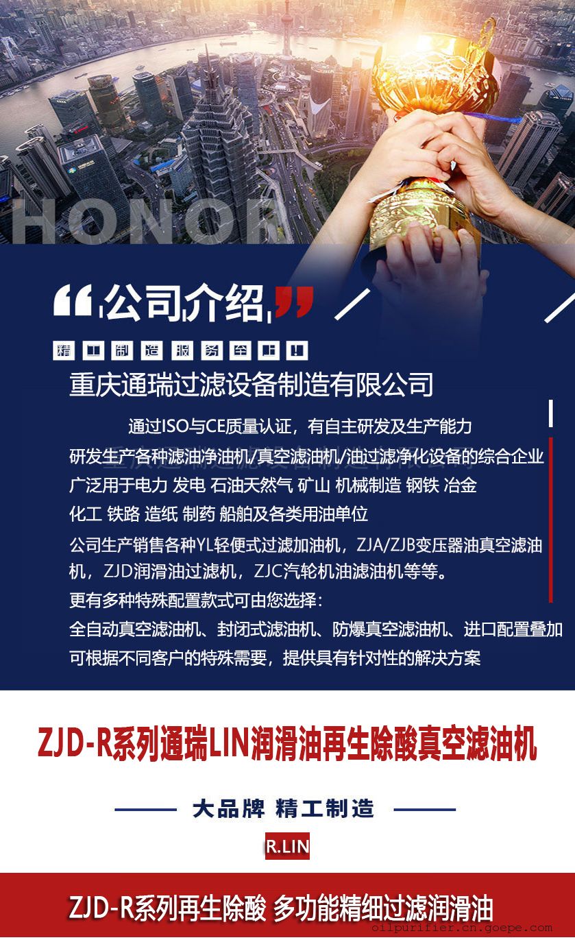 通瑞牌TR/ZJD-R-20润滑油除酸再生多功能滤油机主体高碳钢,耗材为不锈钢席形网滤材(可清洗多次利用)。主体可根据用户要求真空泵、油泵、电气相关主要元件选择进口品牌,可以要求防爆,也可以选择油路管道为304不锈钢。包装:常规为木箱包装,符合国内外长途运输。