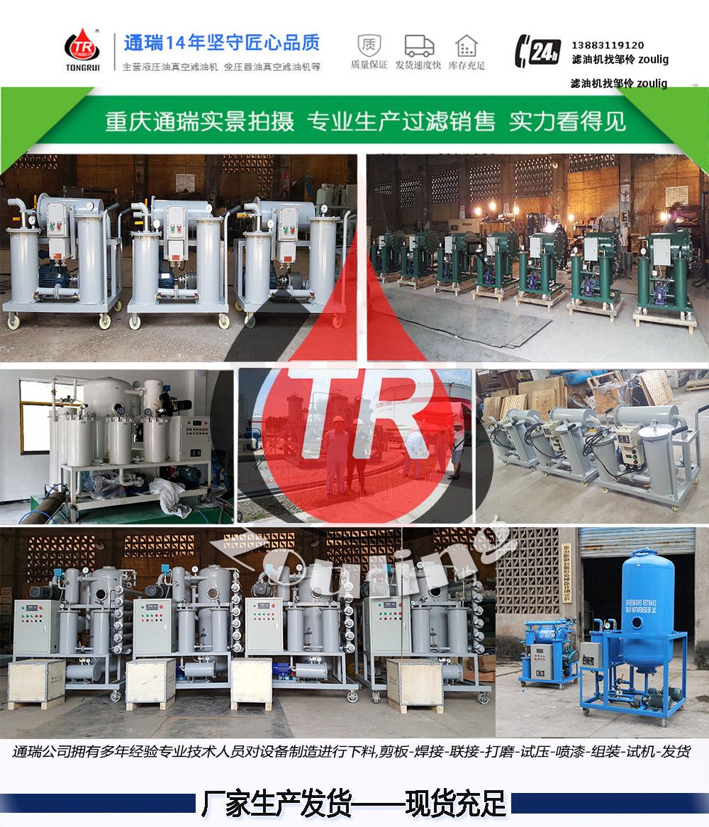 品牌:通瑞 原理:真空过滤 样式:立式 适用对象:燃油 型号:ZJD-F-10Z 滤料类型:纤维 性能:精密过滤 额定流量:1.8 m3/h 工作压力:0.4 MPa 工作噪声:60 dB 进出口管径:25 mm 破乳化值:15 min 清洁度:6-8 NAS 外形尺寸:800*750*900 mm 有效过滤面积:0.28 ㎡ 整机功率:0.75 kw ZJD-F-10Z 汽柴油脱水聚结分离移动式滤油机